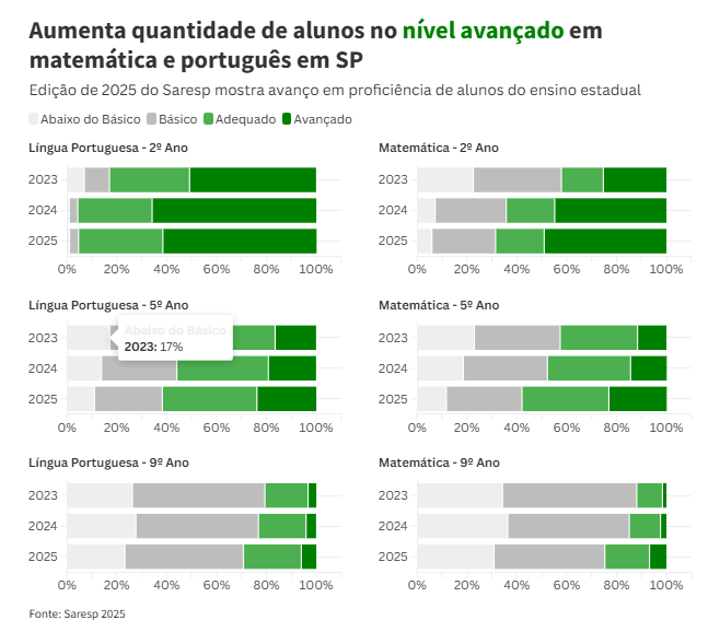 Com mais aulas de língua portuguesa, incluindo os componentes de redação e leitura e orientação de estudos, houve também um aumento da quantidade de alunos que alcançaram os maiores níveis – avançado e adequado. Em 2025, são 24,7% dos estudantes contra 11,9% na edição de 2023.