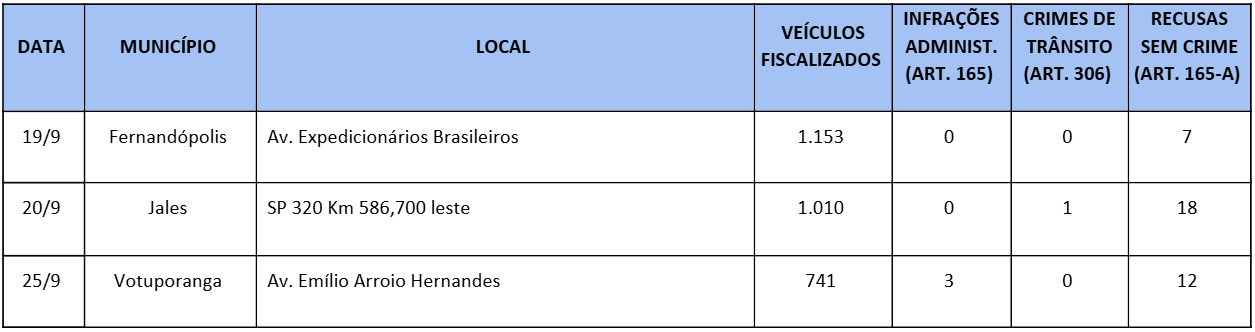 As fiscalizaçõesdaSNT 2025aconteceramem46cidades do estado:Araçariguama, Araçatuba, Assis, Barretos, Bebedouro, Campinas, Capivari, Catanduva, Cordeirópolis,Fernandópolis, Franca,Guapiaçu, Guarulhos, Ilha Solteira, Itapeva, Itapevi, Itaquaquecetuba, Jales, Jundiaí, Lins, Marília, Mauá, Mococa, Mogi das Cruzes, Mogi Guaçu, Osasco, Pindamonhangaba, Piracicaba, Praia Grande, Presidente Prudente, Registro, Rio Claro, Santa Cruz do Rio Pardo, Santa Mercedes, Santo André, Santos, São Carlos,São José do Rio Preto,São José dos Campos, São Paulo, Sertãozinho, Sorocaba, Sumaré, Taquaritinga, Vinhedo e Votuporanga.Nototal,42.418veículosforamfiscalizados, resultando em972infrações, sendo924recusas ao teste do bafômetro, 44autuaçõespor direção sob efeito de álcoole quatro por crime de trânsito - aplicada quando o condutor dirige embriagado.