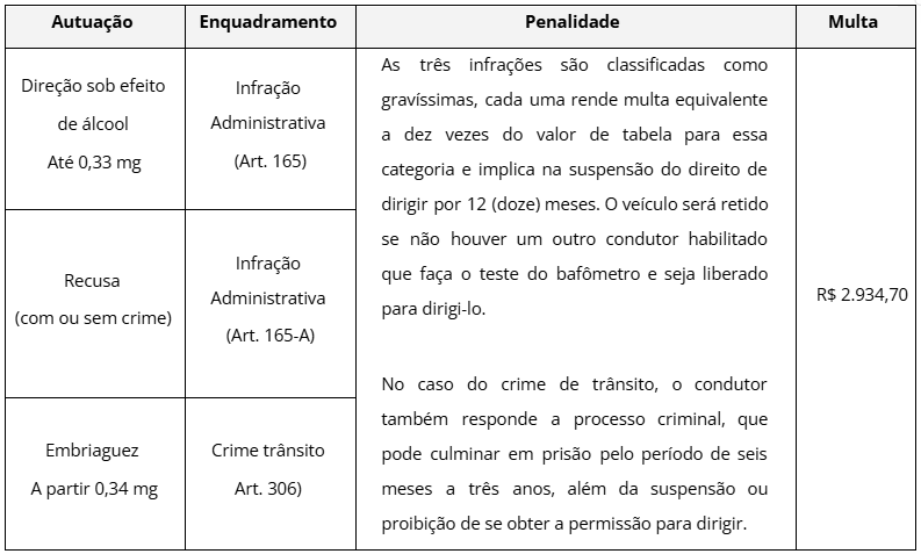 artigo 165-Ado Código de Trânsito Brasileiro (CTB), assim como dirigir sob efeito de álcool – quando o teste afere índice de até 0,33 mg de álcool por litro de ar expelido –, de acordo com o
