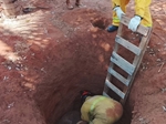 A equipe da Brigada Municipal de Castilho com apoio de uma pá carregadeira da Prefeitura conseguiu resgatar ontem (11) uma vaca que havia caído em um buraco, na zona rural.