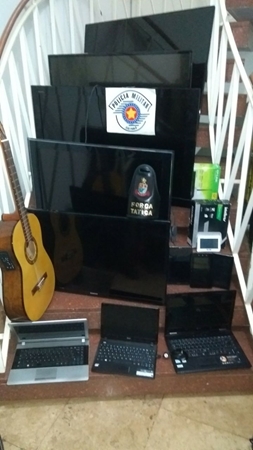 A motocicleta que estava com ele estava com numeração do chassi suprimida, sem documentação, trazia uma placa que não condizia com a numeração do motor. Após a abordagem, os policiais foram até à casa dele, que fica defronte ao local da abordagem e, no interior da residência foram constatados vários produtos de procedência suspeita amontoados pelos cômodos da casa, dentre eles, vários Televisores de LED, Notebooks, Tabletes, perfumes, joias, relógios, um violão elétrico, aparelhos de DVD, celas completas com barrigueira, roteadores de sinal dentre outras dezenas de objetos. Continuando as buscas, pelo local, a equipe localizou certa quantidade de drogas, sendo estas, maconha, crack, além de dinheiro e apetrechos para manipulação das drogas.