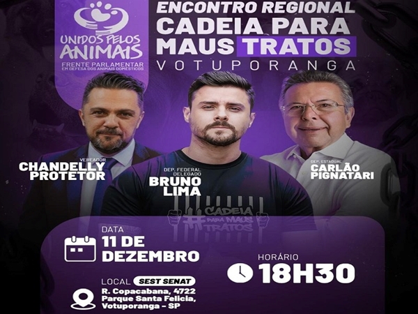 A Frente Parlamentar em Defesa dos Animais da Assembleia Legislativa, coordenada pelo deputado Carlão Pignatari, promoverá no dia 11 de dezembro, às 18h30, no Sest Senat de Votuporanga, um grande encontro regional dedicado ao fortalecimento das políticas públicas de proteção animal. O evento reunirá lideranças, protetores, tutores e simpatizantes da causa, contando com a presença do deputado federal e delegado Bruno Lima, idealizador do Projeto Cadeia para Maus Tratos e uma das principais referências do país no enfrentamento à violência contra animais.Ao lado do deputado Carlão, o secretário municipal de Bem Estar Animal, Chandelly Protetor, é um dos organizadores do encontro, que integra municípios da região e busca ampliar a mobilização em torno de políticas públicas estruturadas. A pauta animal também envolve saúde pública, já que políticas de castração, microchipagem, prevenção de zoonoses e combate aos maus tratos impactam diretamente o bem-estar das famílias.Na Alesp, o deputado Carlão se destaca pela atuação forte e contínua na defesa dos animais. Nos últimos anos destinou milhões de reais para diversos municípios paulistas, garantindo investimentos em castrações, microchipagem, equipamentos, veículos, estruturas de acolhimento e ações permanentes de proteção. Entre suas maiores conquistas está a articulação para viabilizar a primeira clínica veterinária pública do Estado de São Paulo, um marco para o cuidado animal e para o acesso da população a serviços essenciais.Chandelly Protetor ressalta que a realização do evento fortalece a união regional. “Estamos construindo uma agenda firme e responsável pela proteção animal. A presença do deputado Bruno Lima ao lado do deputado Carlão reforça que nossa região está engajada e preparada para avançar, unindo quem trabalha todos os dias pelos animais.”Para participar, é necessário realizar cadastro prévio, garantindo organização e melhor acomodação dos participantes. O formulário oficial está disponível em: